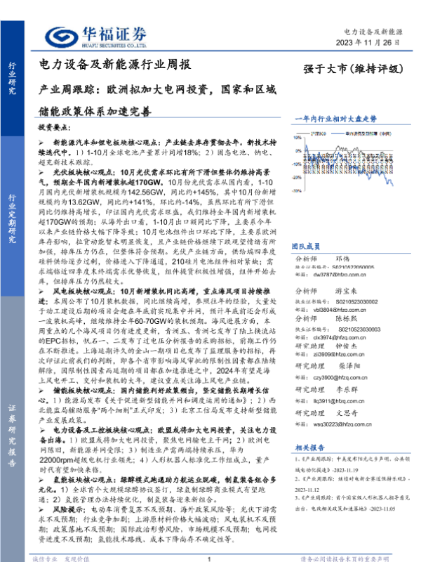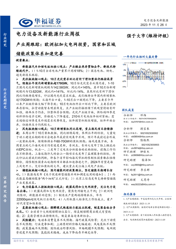 【华福证券】【20231126】电力设备及新能源行业周报:产业周跟踪:欧洲拟加大电网投资,国家和区域储能政策体系加速完善-17页