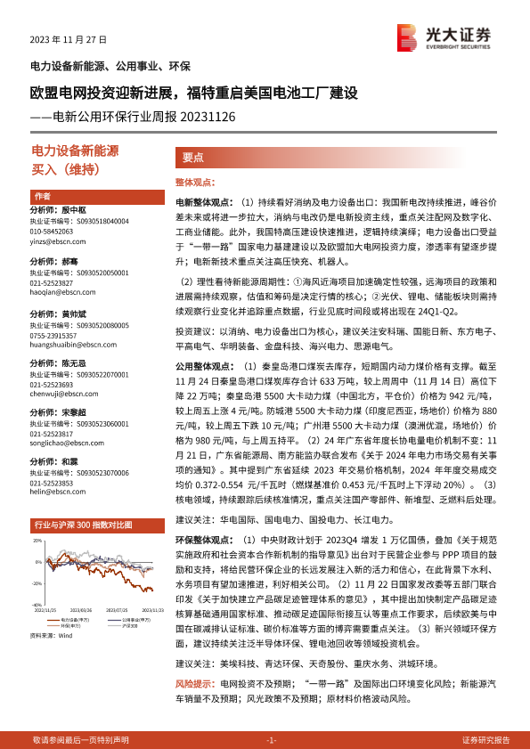 【光大证券】【20231126】电新公用环保行业周报:欧盟电网投资迎新进展,福特重启美国电池工厂建设-23页