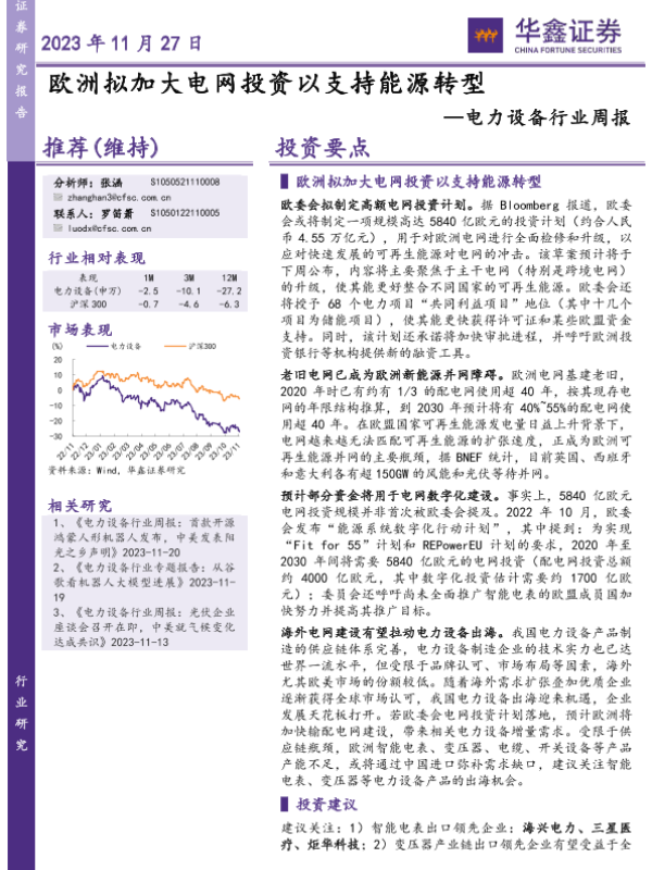 【华鑫证券】【20231127】电力设备行业周报:欧洲拟加大电网投资以支持能源转型-15页