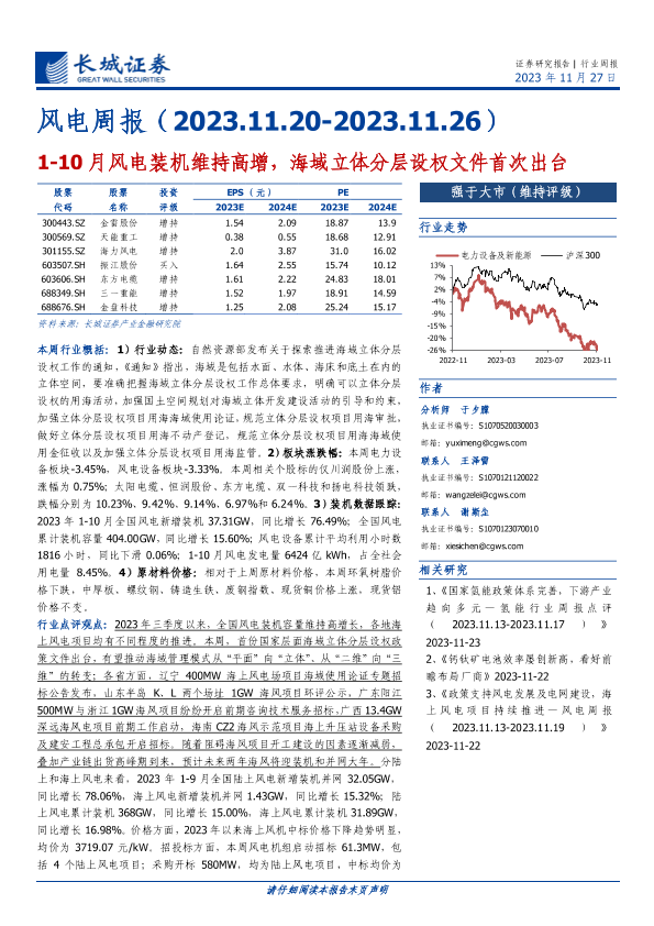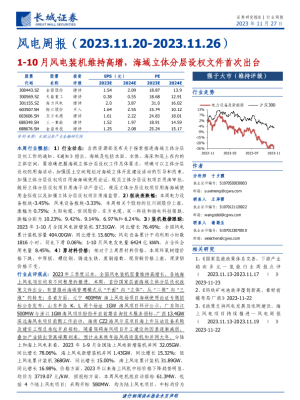 【长城证券】【20231127】20231127-长城证券-风电周报:1-10月风电装机维持高增,海域立体分层设权文件首次出台-13页