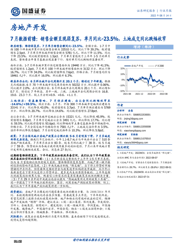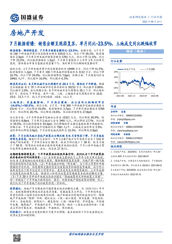 【国盛证券】【20220814】房地产开发行业7月数据前瞻:销售金额呈现弱复苏,单月同比下降23.5%,土地成交同比跌幅收窄-17页