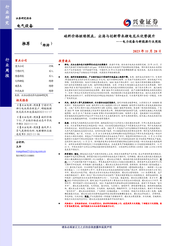 【兴业证券】【20231128】硅料价格继续探底,出海与创新带来锂电龙头优势提升——电力设备与新能源行业周报-19页