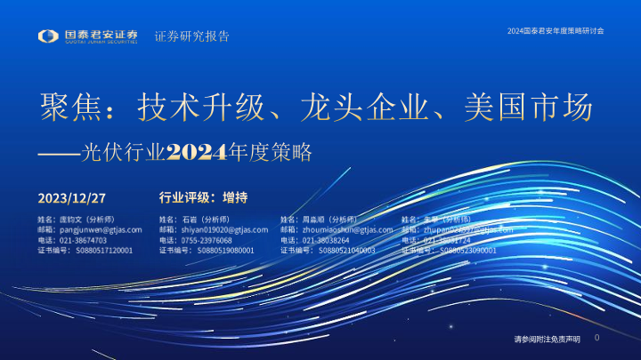 【国泰君安证券】【20231227】光伏行业2024年度策略:聚焦:技术升级、龙头企业、美国市场-50页
