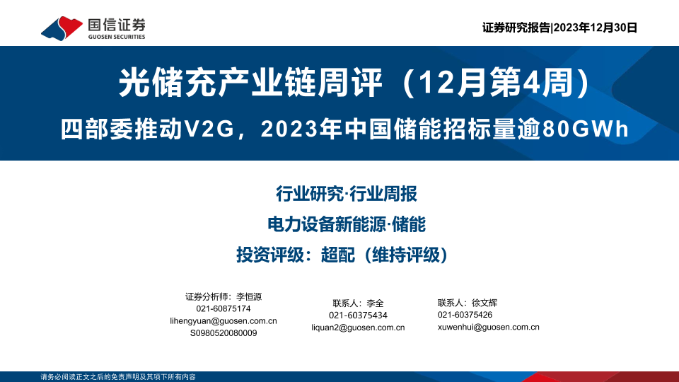【国信证券】【20231230】光储充产业链周评(12月第4周):四部委推动V2G,2023年中国储能招标量逾80GWh-27页
