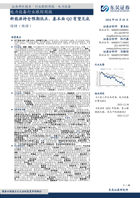 【东吴证券】【20240101】电力设备行业跟踪周报:新能源持仓预期低点,基本面Q2有望见底-41页