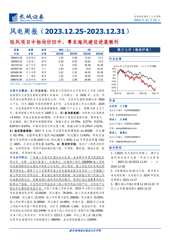【长城证券】【20240102】风电周报:陆风项目中标均价回升,粤东海风建设进展顺利-13页