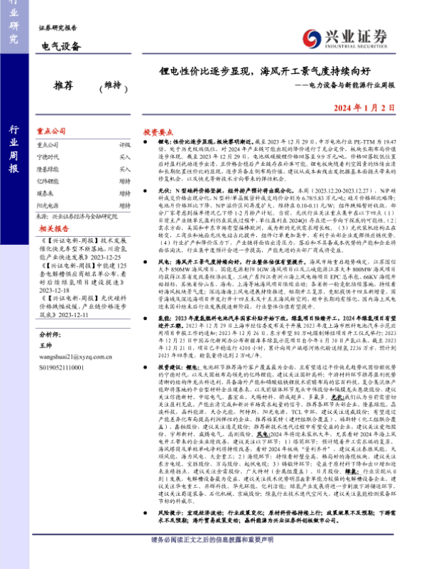 【兴业证券】【20240102】锂电性价比逐步显现,海风开工景气度持续向好——电力设备与新能源行业周报-19页