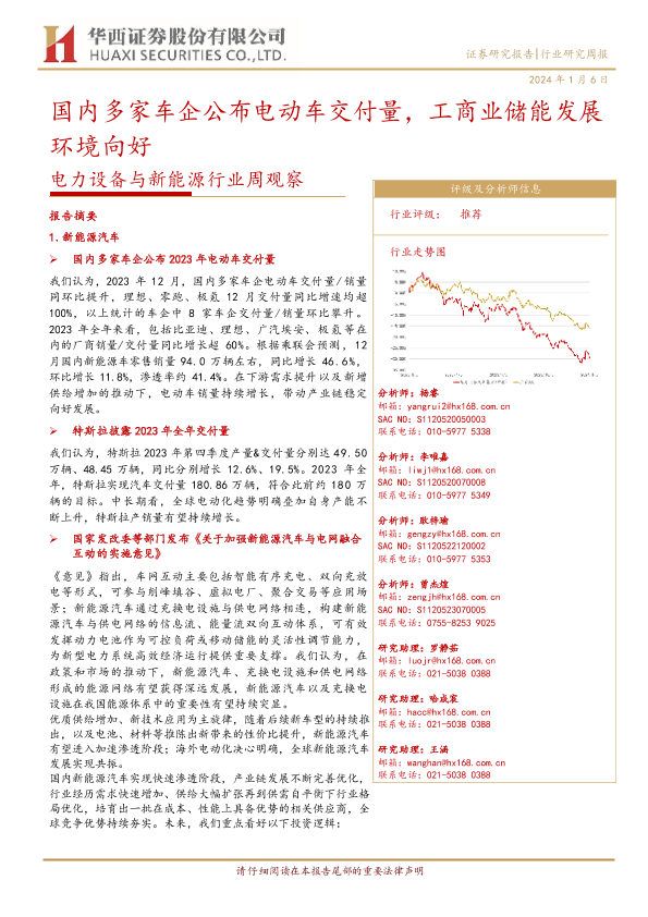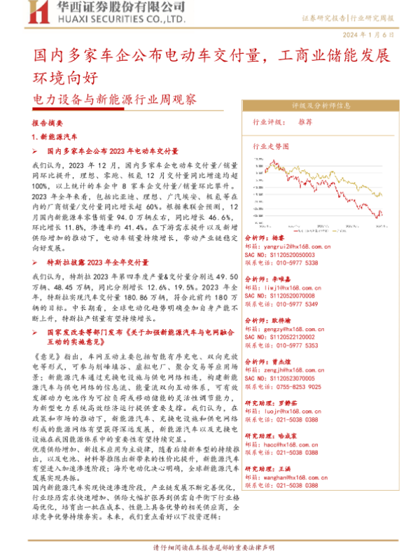 【华西证券】【20240106】电力设备与新能源行业周观察:国内多家车企公布电动车交付量,工商业储能发展环境向好-30页