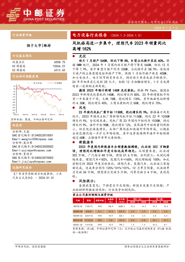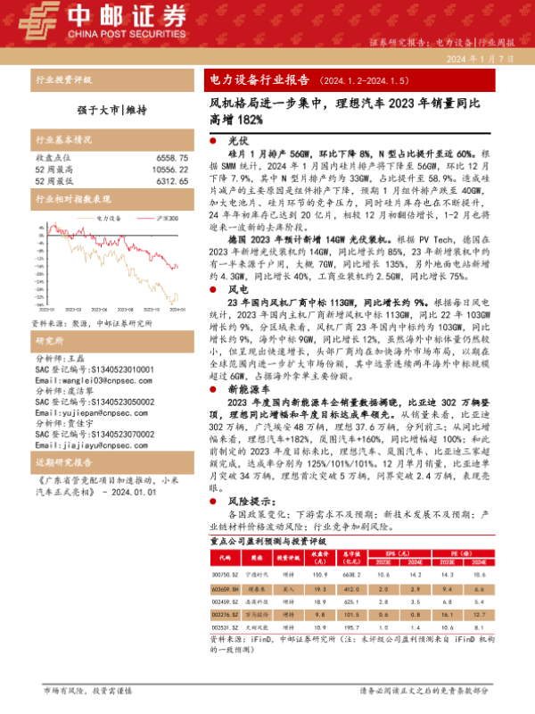 【中邮证券】【20240107】电力设备行业报告:风机格局进一步集中,理想汽车2023年销量同比高增182%-19页