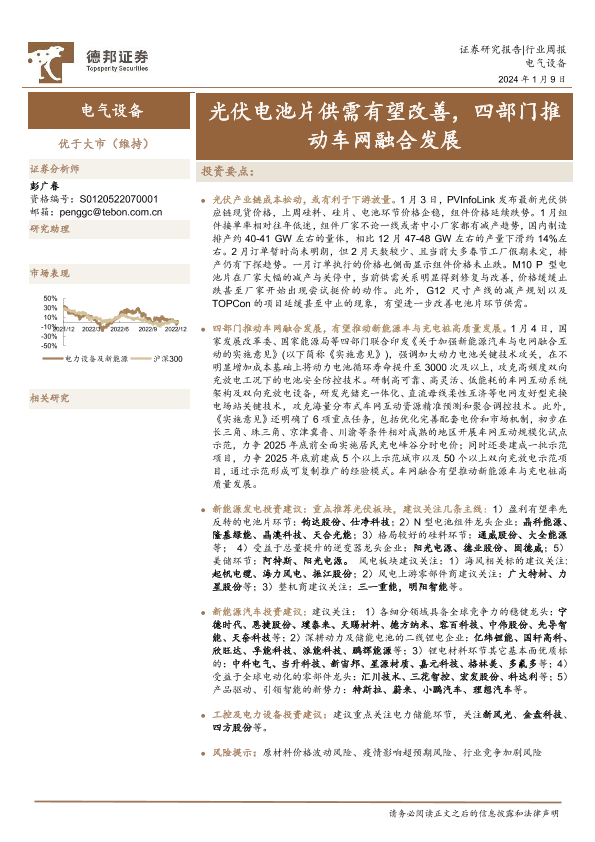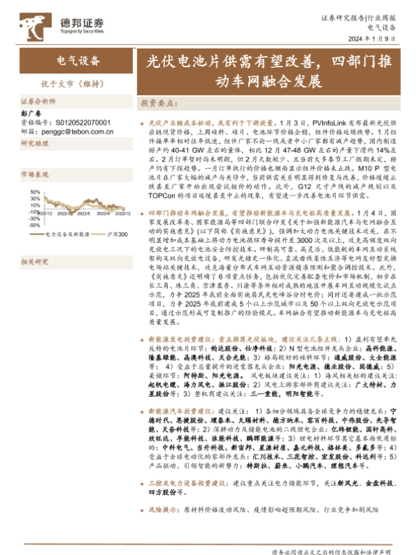 【德邦证券】【20240109】电气设备行业周报:光伏电池片供需有望改善,四部门推动车网融合发展-13页