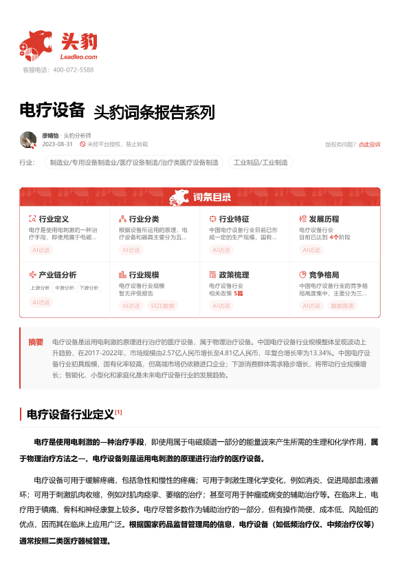 【头豹研究院】【20240110】电疗设备 头豹词条报告系列-19页