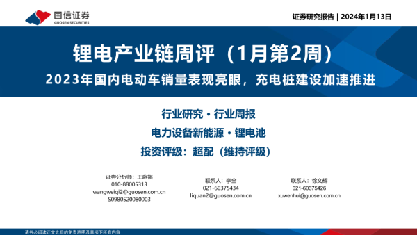 【国信证券】【20240113】20240113-国信证券-锂电产业链周评(1月第2周):2023年国内电动车销量表现亮眼,充电桩建设加速推进-22页