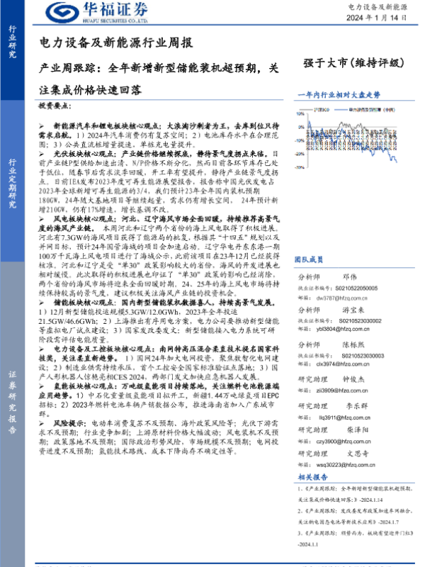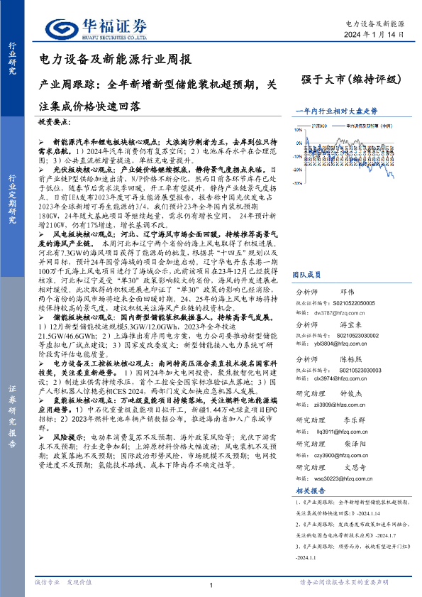 【华福证券】【20240114】电力设备及新能源行业周报:产业周跟踪:全年新增新型储能装机超预期,关注集成价格快速回落-18页