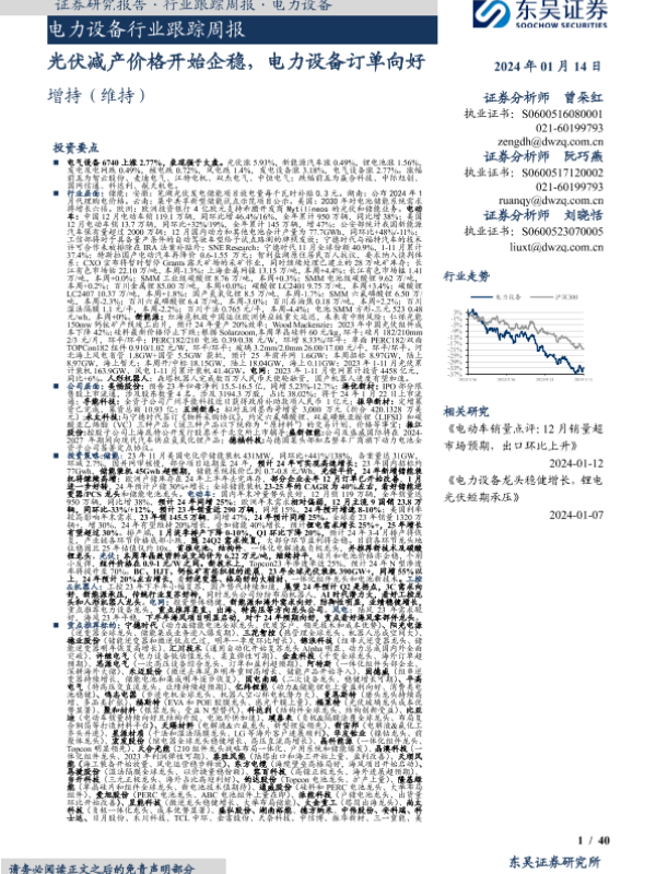 【东吴证券】【20240114】电力设备行业跟踪周报:光伏减产价格开始企稳,电力设备订单向好-40页