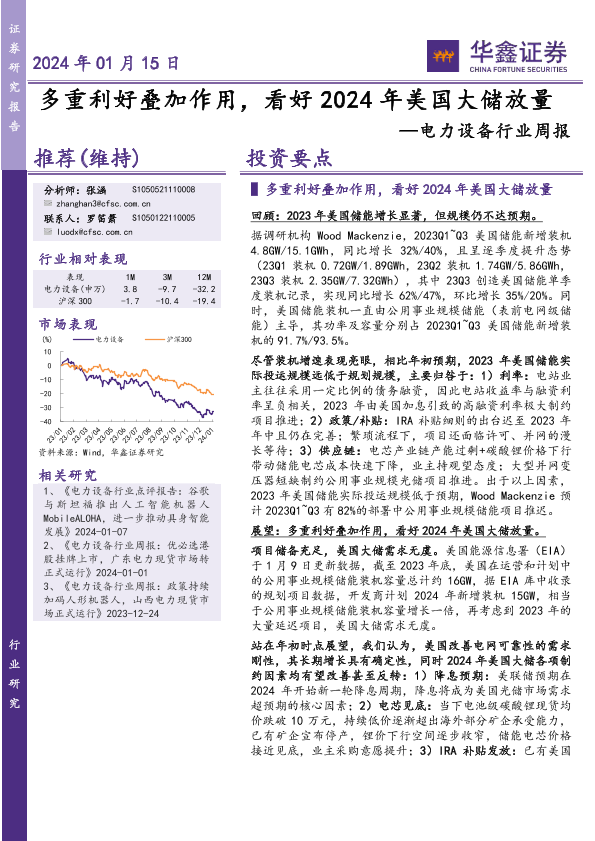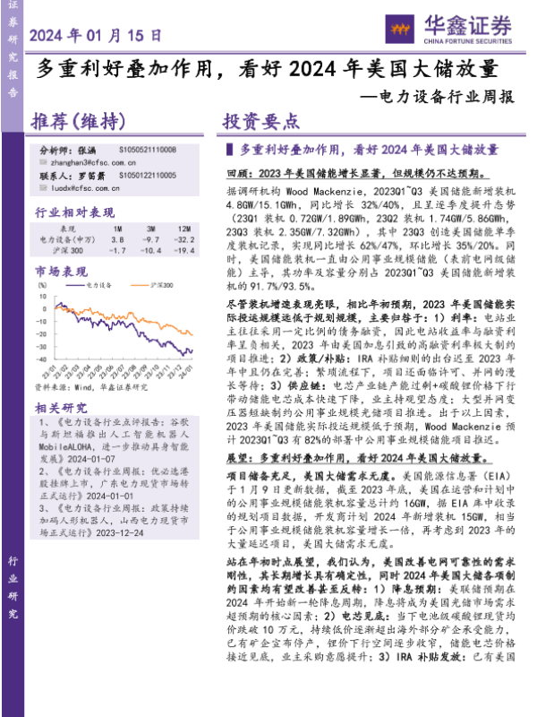 【华鑫证券】【20240115】20240115-华鑫证券-电力设备行业周报:多重利好叠加作用,看好2024年美国大储放量-15页