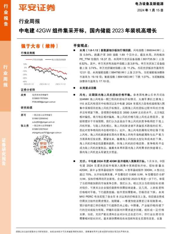 【平安证券】【20240115】电力设备及新能源行业周报:中电建42GW组件集采开标,国内储能2023年装机高增长-23页