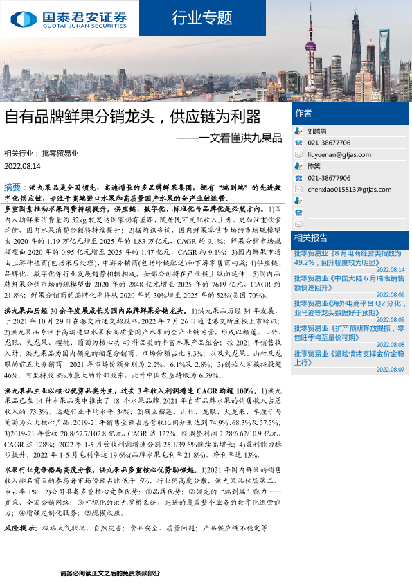 【国泰君安证券】【20220814】自有品牌鲜果分销龙头,供应链为利器——一文看懂洪九果品-41页