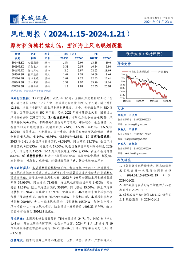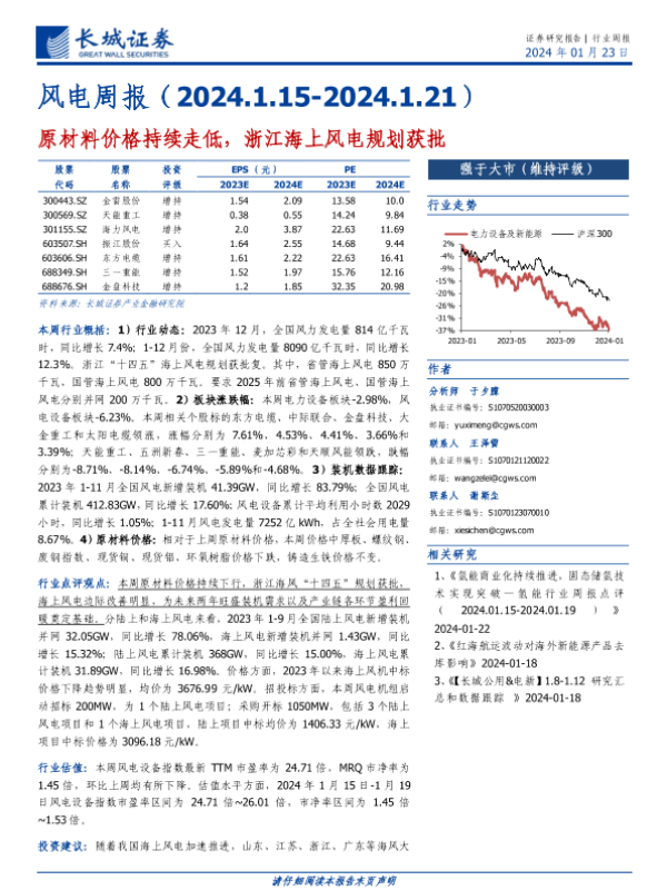 【长城证券】【20240123】风电行业周报:原材料价格持续走低,浙江海上风电规划获批-13页
