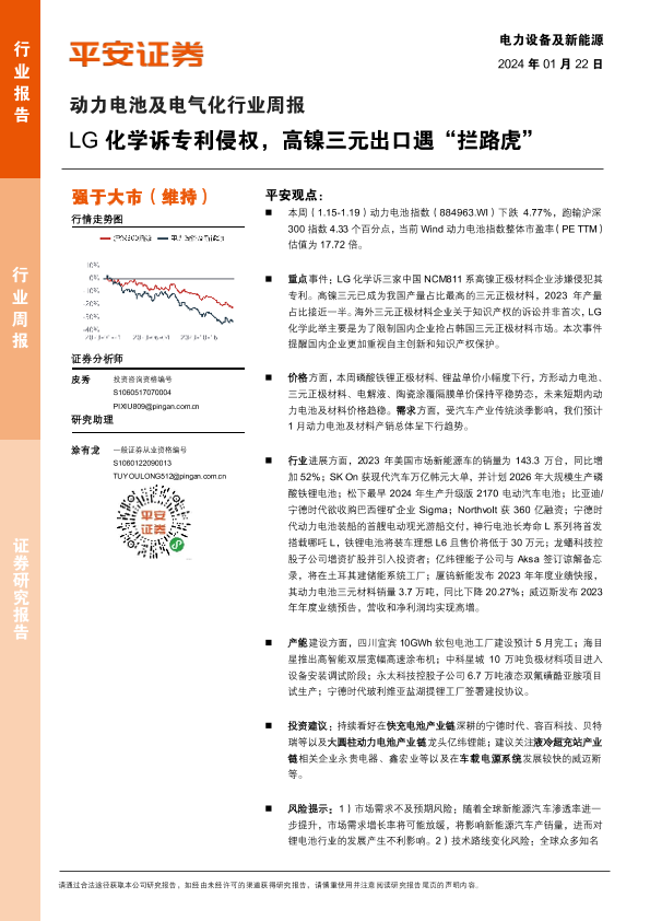 【平安证券】【20240122】动力电池及电气化行业周报:LG化学诉专利侵权,高镍三元出口遇“拦路虎”-12页