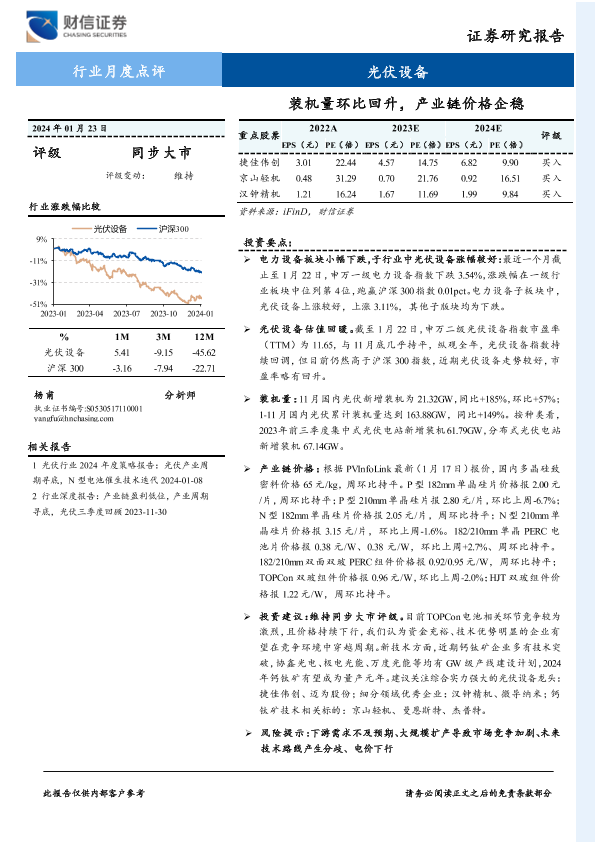 【财信证券】【20240123】光伏设备行业月度点评:装机量环比回升,产业链价格企稳-14页