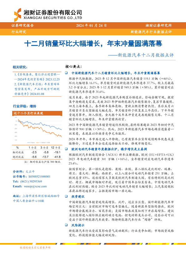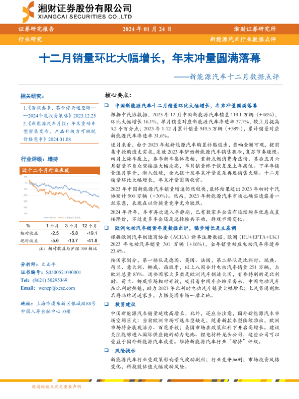 【湘财证券】【20240124】新能源汽车十二月数据点评:十二月销量环比大幅增长,年末冲量圆满落幕-17页