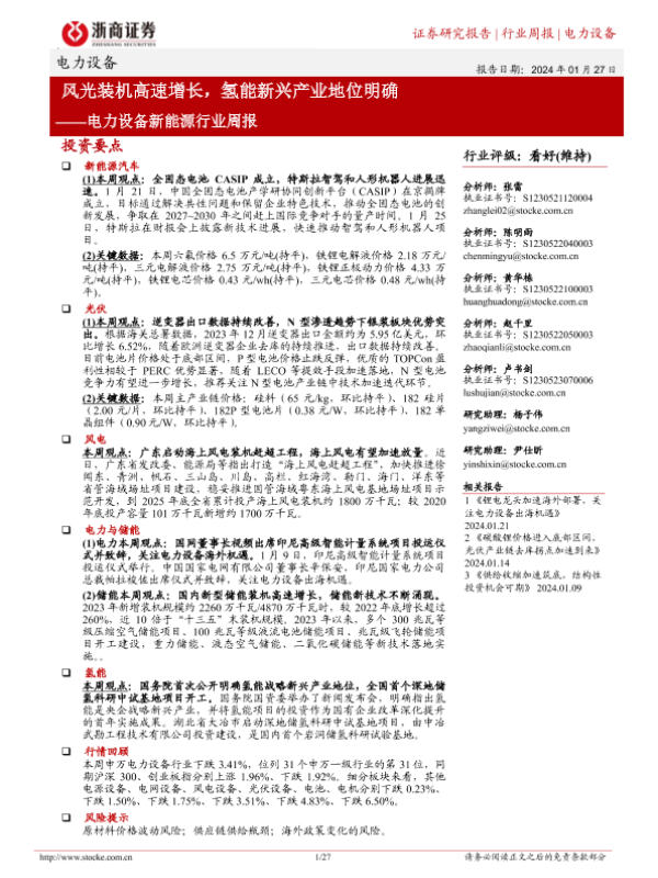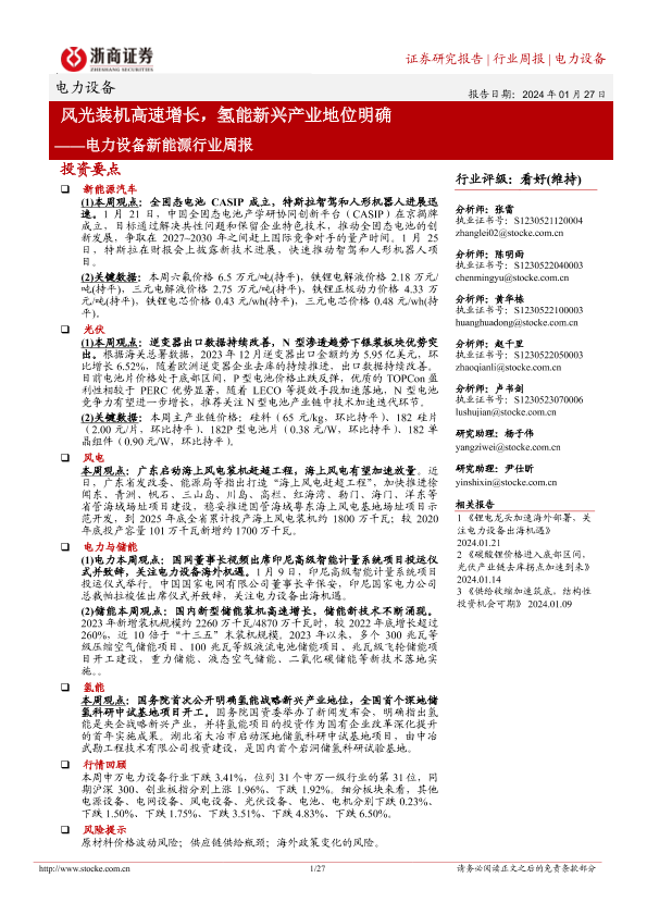 【浙商证券】【20240127】20240127-浙商证券-电力设备新能源行业周报:风光装机高速增长,氢能新兴产业地位明确-27页