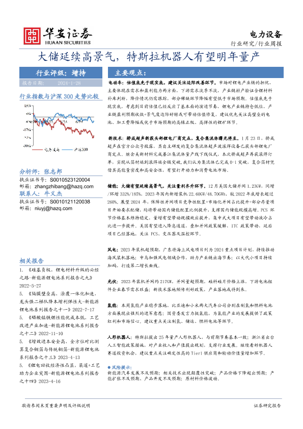 【华安证券】【20240128】20240128-华安证券-电力设备行业周报:大储延续高景气,特斯拉机器人有望明年量产-24页