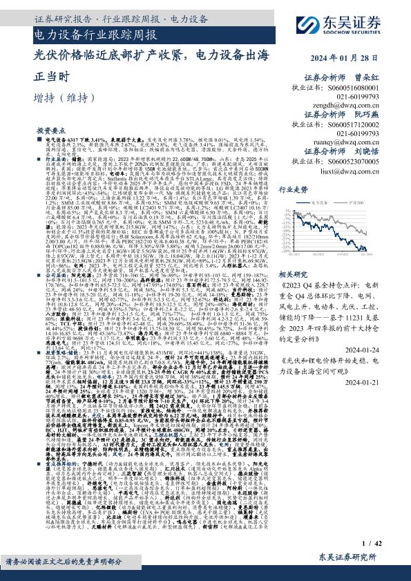 【东吴证券】【20240128】电力设备行业跟踪周报:光伏价格临近底部扩产收紧,电力设备出海正当时-42页