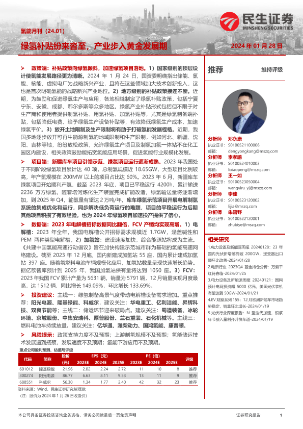 【民生证券】【20240128】氢能月刊(24.01):绿氢补贴纷来沓至,产业步入黄金发展期-22页