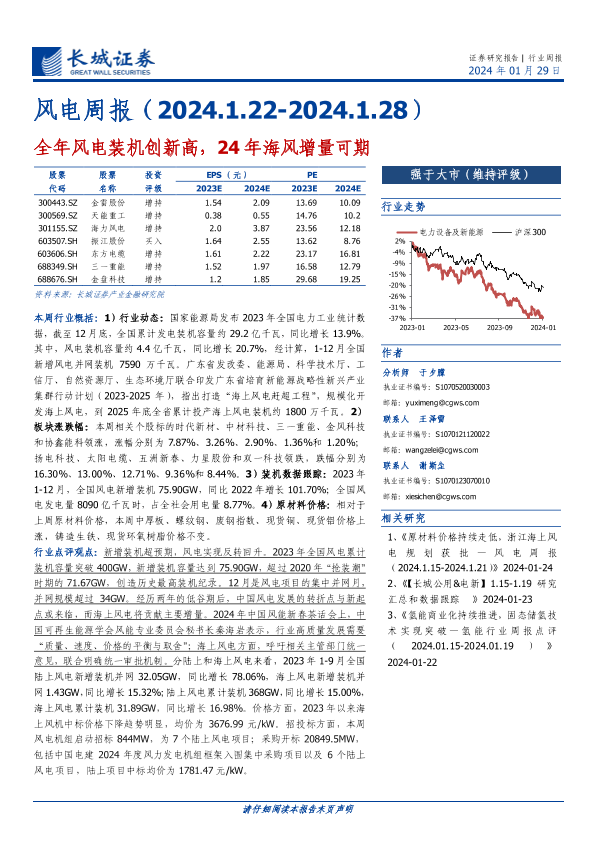 【长城证券】【20240129】20240129-长城证券-风电周报:全年风电装机创新高,24年海风增量可期-13页