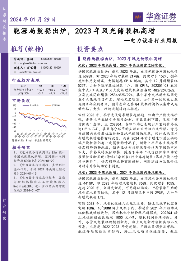 【华鑫证券】【20240129】电力设备行业周报:能源局数据出炉,2023年风光储装机高增-18页
