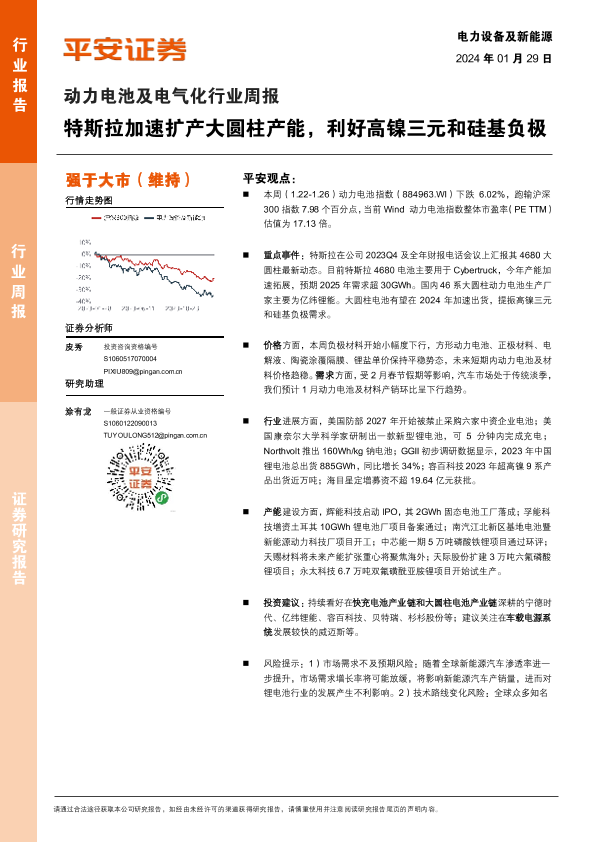 【平安证券】【20240129】20240129-平安证券-动力电池及电气化行业周报:特斯拉加速扩产大圆柱产能,利好高镍三元和硅基负极-12页