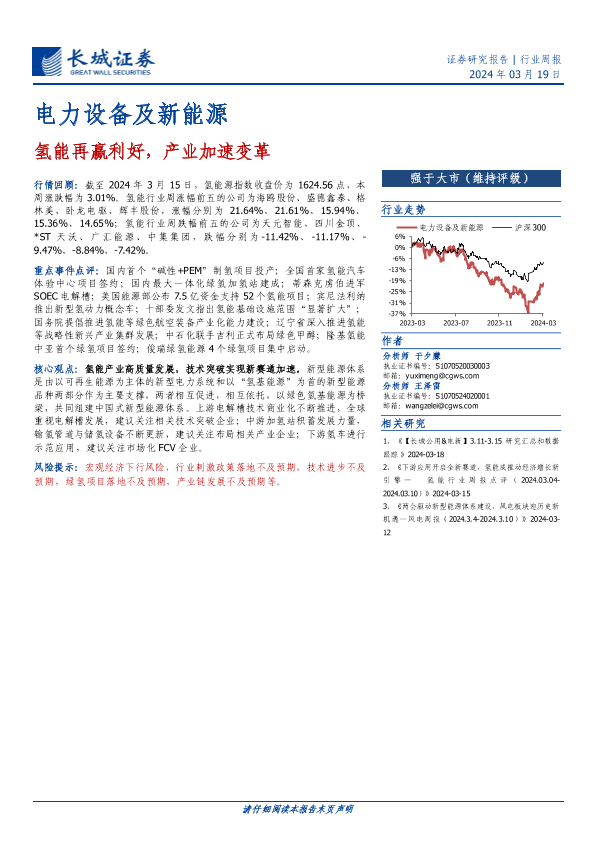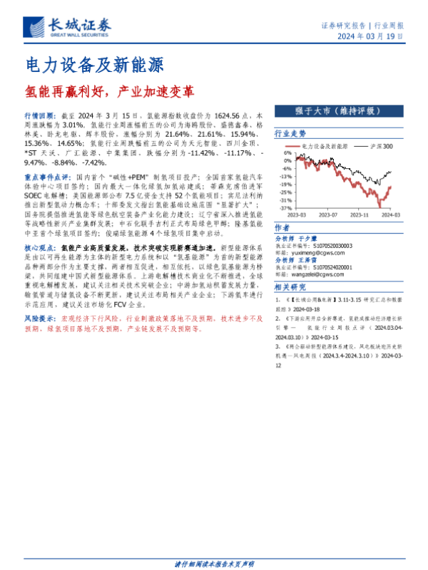 【长城证券】【20240319】20240319-长城证券-电力设备及新能源行业周报:氢能再赢利好,产业加速变革-12页