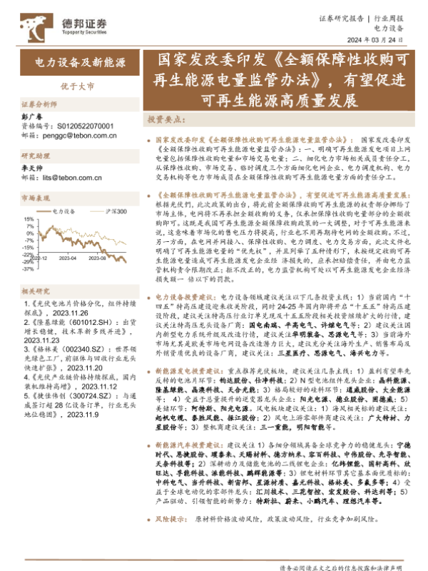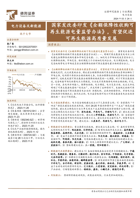 【德邦证券】【20240324】电力设备及新能源行业周报:国家发改委印发《全额保障性收购可再生能源电量监管办法》,有望促进可再生能源高质量发展-15页