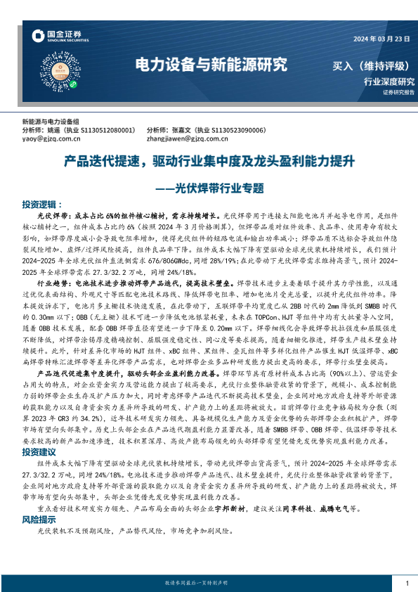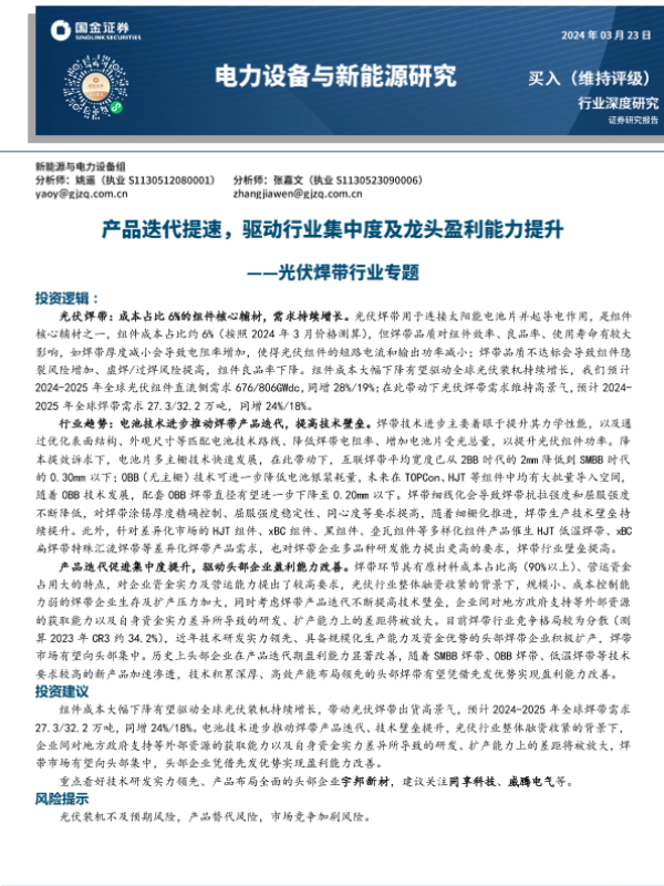 【国金证券】【20240323】光伏焊带行业专题:产品迭代提速,驱动行业集中度及龙头盈利能力提升-29页