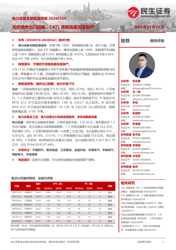 【民生证券】【20240324】电力设备及新能源周报:光伏组件出口回暖,CATL滑板底盘加速量产-23页