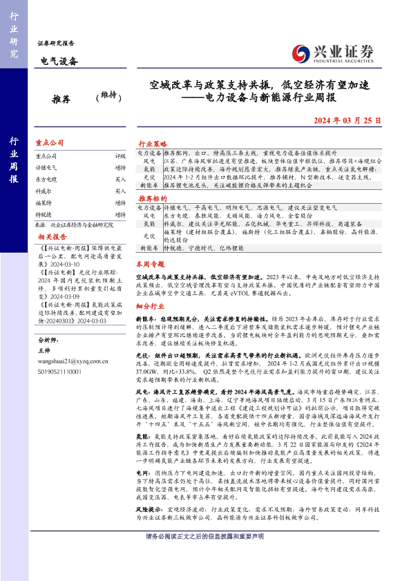 【兴业证券】【20240325】空域改革与政策支持共振,低空经济有望加速 ——电力设备与新能源行业周报-19页