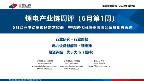 【国信证券】【20240609】锂电产业链周评(6月第1周):5月欧洲电动车市场需求较弱,宁德时代回应美国国会议员相关表述-18页