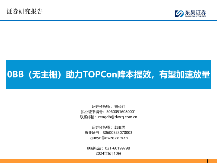 【东吴证券】【20240610】0BB(无主栅)助力TOPCon降本提效,有望加速放量-38页