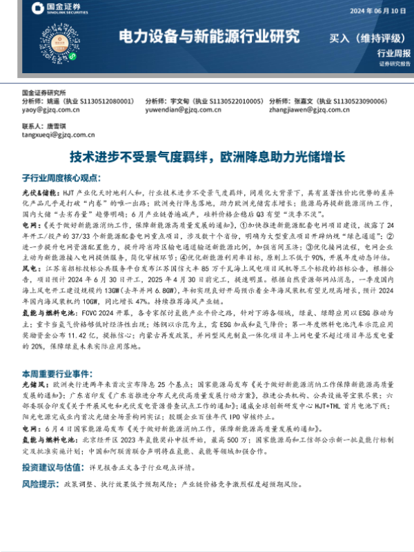 【国金证券】【20240610】电力设备与新能源行业研究:技术进步不受景气度羁绊,欧洲降息助力光储增长-10页