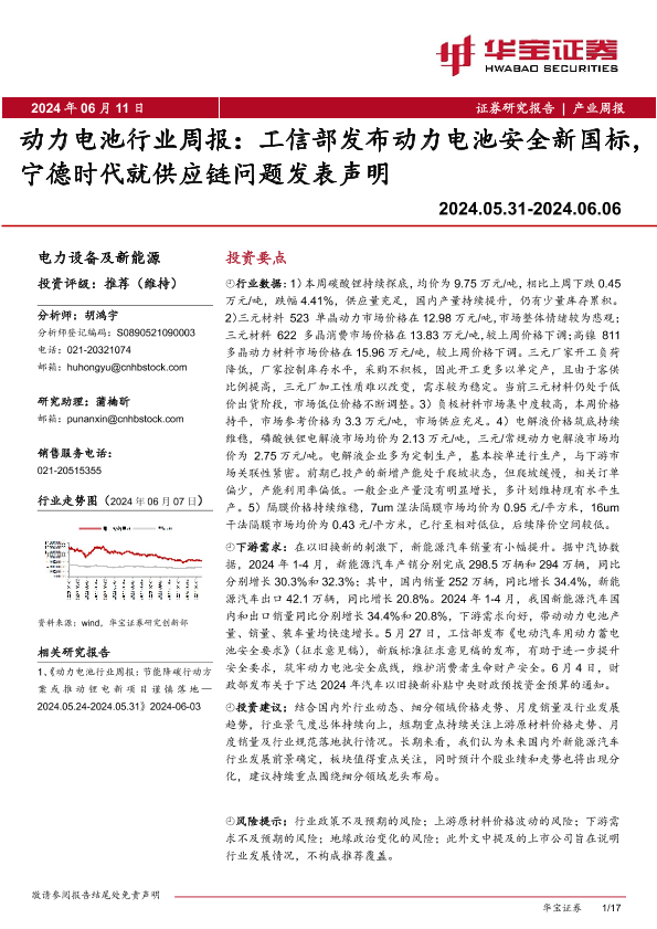【华宝证券】【20240611】动力电池行业周报:工信部发布动力电池安全新国标,宁德时代就供应链问题发表声明-17页