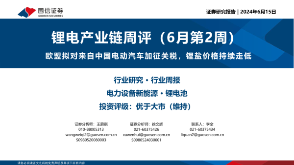 【国信证券】【20240615】锂电产业链周评(6月第2周):欧盟拟对来自中国电动汽车加征关税,锂盐价格持续走低-18页