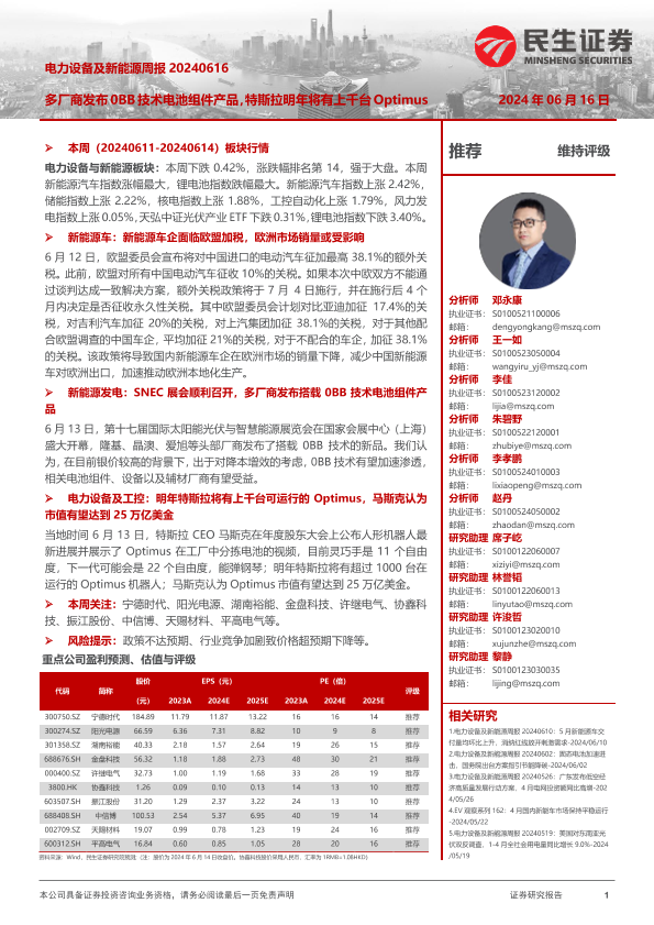 【民生证券】【20240616】电力设备及新能源周报:多厂商发布0BB技术电池组件产品,特斯拉明年将有上千台Optimus-24页