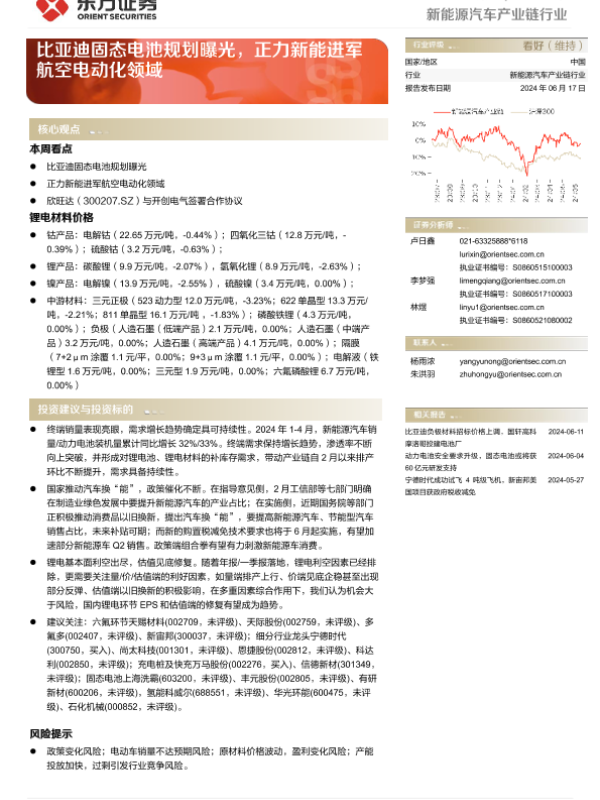 【东方证券】【20240617】20240617-东方证券-新能源汽车产业链行业周报:比亚迪固态电池规划曝光,正力新能进军航空电动化领域-13页