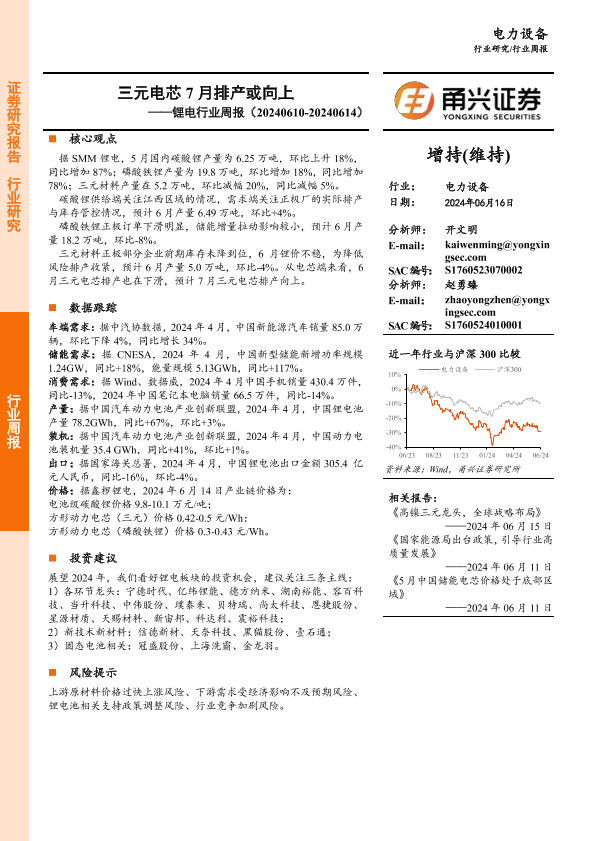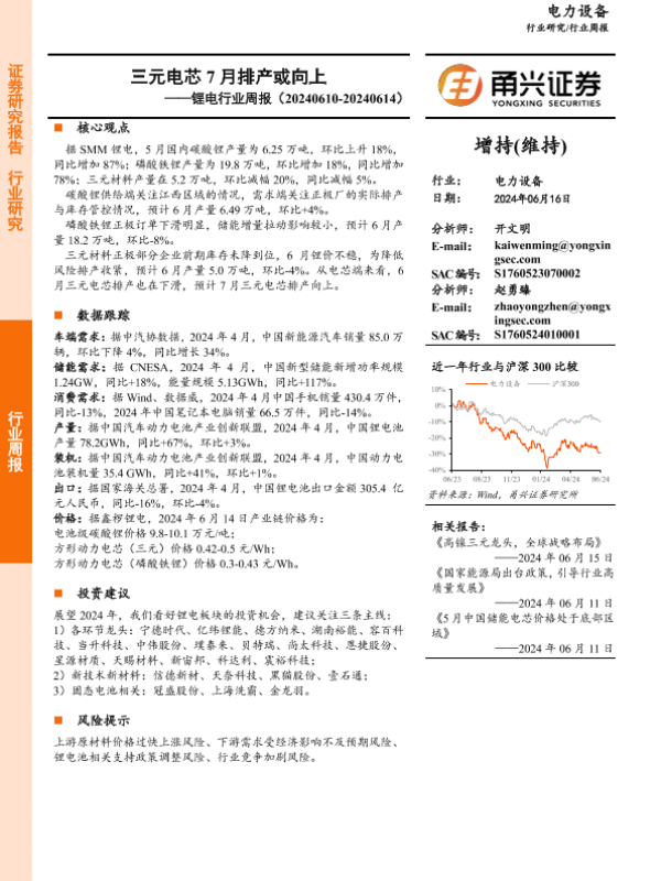 【甬兴证券】【20240616】20240616-甬兴证券-锂电行业周报:三元电芯7月排产或向上-14页