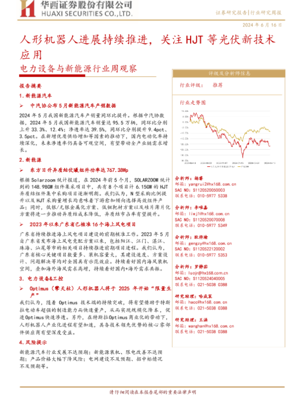 【华西证券】【20240616】电力设备与新能源行业周观察:人形机器人进展持续推进,关注HJT等光伏新技术应用-22页