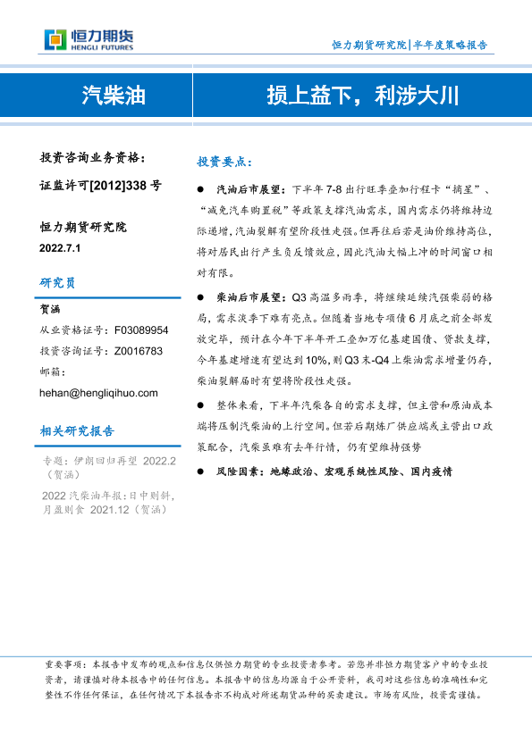 【恒力期货】【20220701】汽柴油半年度策略报告:损上益下,利涉大川-20页