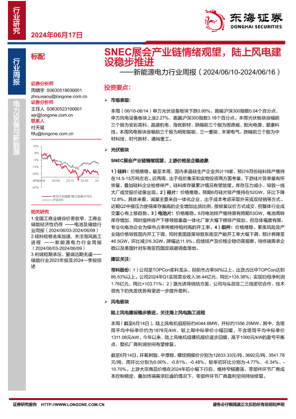 【东海证券】【20240617】20240617-东海证券-新能源电力行业周报:SNEC展会产业链情绪观望,陆上风电建设稳步推进-17页