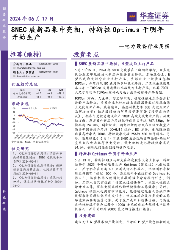 【华鑫证券】【20240617】20240617-华鑫证券-电力设备行业周报:SNEC展新品集中亮相,特斯拉Optimus于明年开始生产-15页