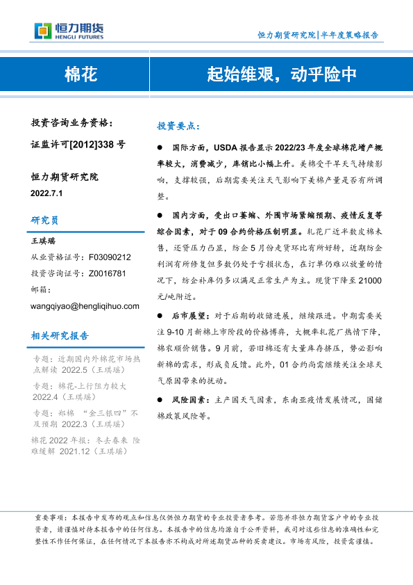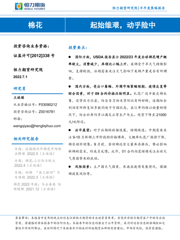 【恒力期货】【20220701】棉花半年度策略报告:起始维艰,动乎险中-15页